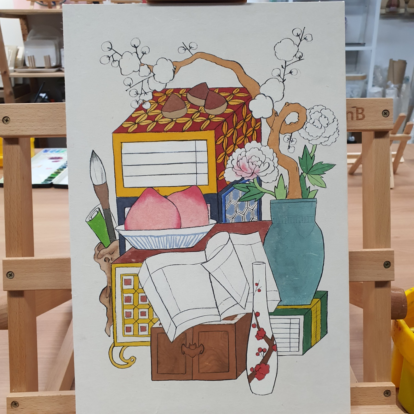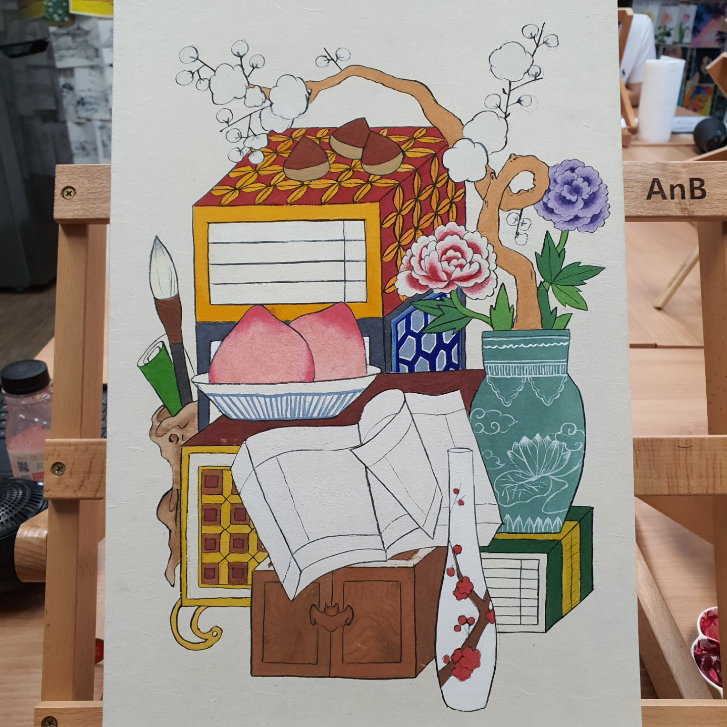 책가도를 그리면서 좋아하는 의미를 담기도 했고, 자유로운 채색에 그림에 꽤나 만족스러웠습니다.